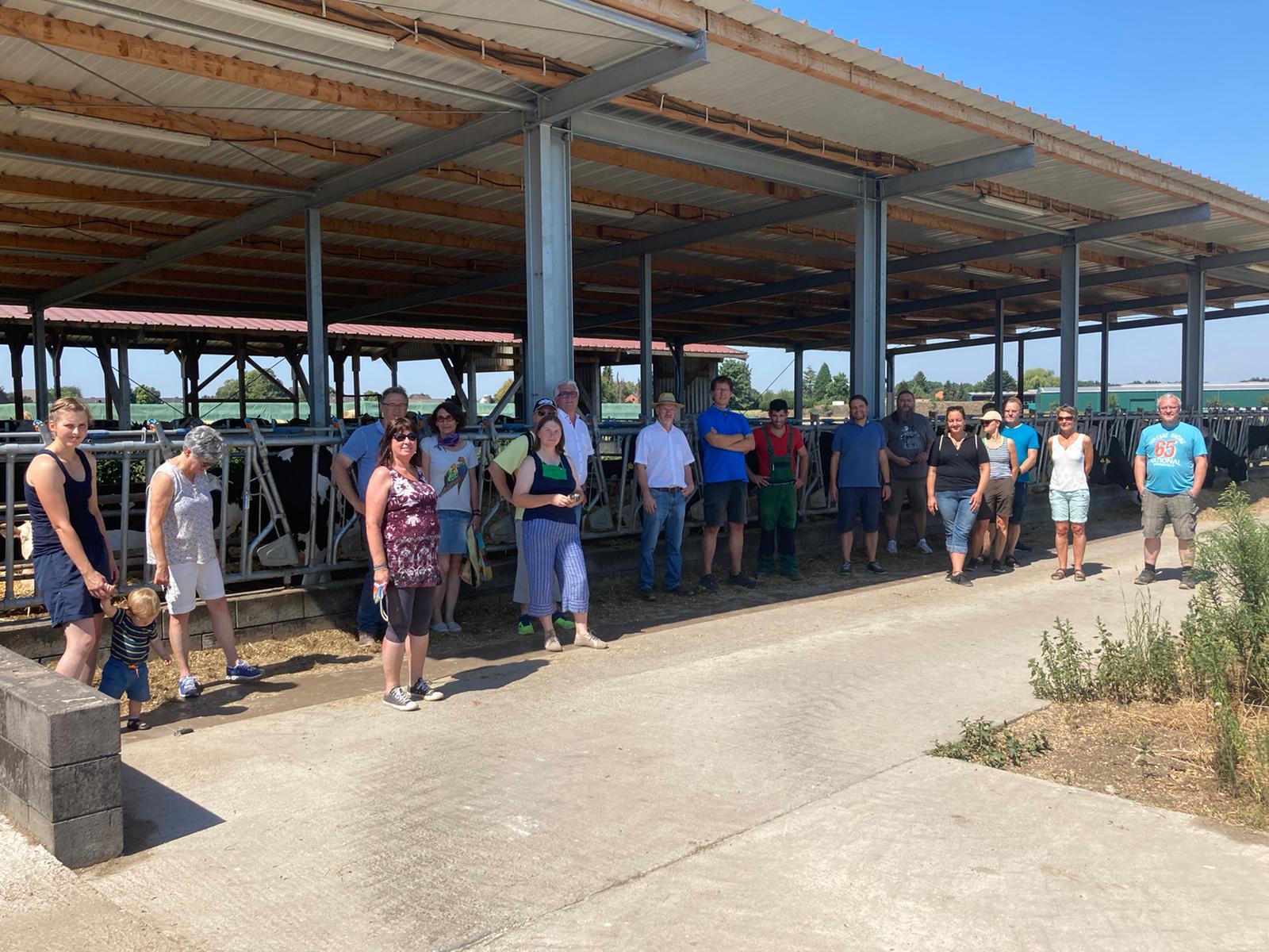 Heute trafen wir uns auf Einladung der Niederkrüchtener Grünen auf der Hofanlage der Familie Bonus in Niederkrüchten. Jan Bonus ist Milchbauer und besitzt etwa 200 Kühe. Die Kühe stehen in einem offenen Stall zwischen den Feldern. Man nennt diese Art Stall wegen der offenen Bauweise auch Klimastall, denn er sorgt dafür, dass die Tiere auch an sehr heißen Tagen wie heute immer frische Luft haben. Trotzdem bleibt die Hitze ein Problem. Wenn’s den Kühen zu warm ist, geben sie weniger Milch. Wir sprachen über die aktuellen Probleme in der Milchwirtschaft, die es familiengeführten landwirtschaftlichen Unternehmen nicht immer leicht machen. Außerdem erhielten wir intensive Einblicke in die Abläufe eines solchen Betriebes und aufschlussreiche, verständnisanregende Erläuterungen.
