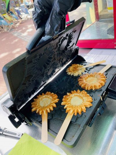 Vor unserem Waffel- und Popcorn-Stand bildete sich eine lange Schlange. Vor allem die Sonnenblumen-Waffeln am Stiel waren sehr begehrt. Unsere Leute hatten alle Hände voll zu tun.
