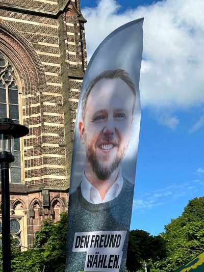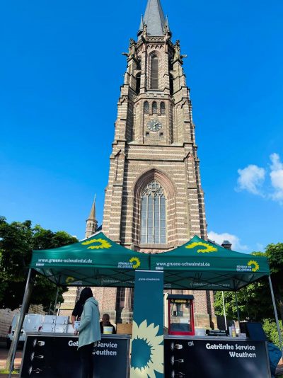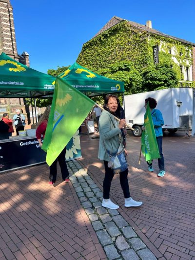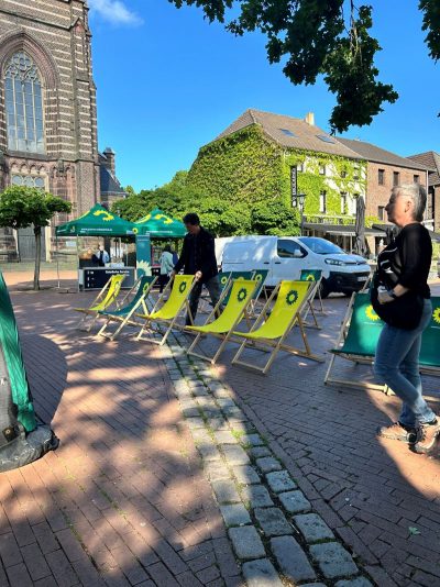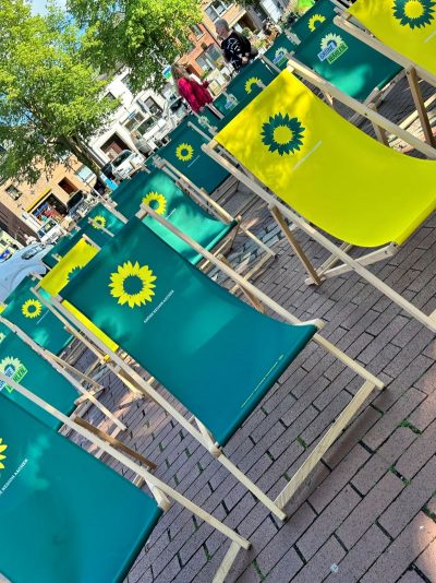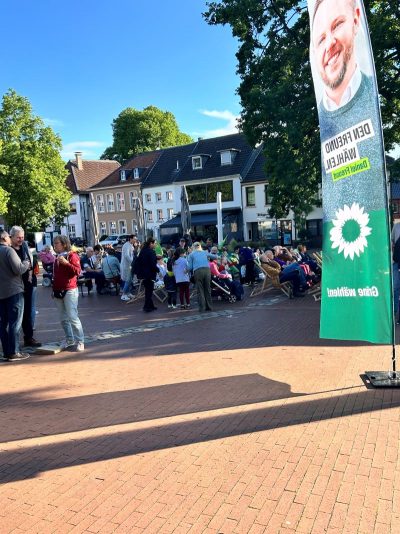 Gegen 18.30 Uhr war alles aufgebaut. Andreas und Benny vom Daniel-Freund-Wahlkampfteam fragten sich, ob wir denn wohl so viele Plätze brauchen würden. Selbst in Düsseldorf und Aachen hätte man nicht so viele gebraucht. Wir hingegen hatten sogar noch zusätzliche Bierbänke besorgt. Wir sahen das gelassen und waren sicher, das wird voll. Möglicherweise hatten die anderen Ortsverbände nicht so tolle fahnenschwenkende Cheerleaderinnen wie wir? 😉