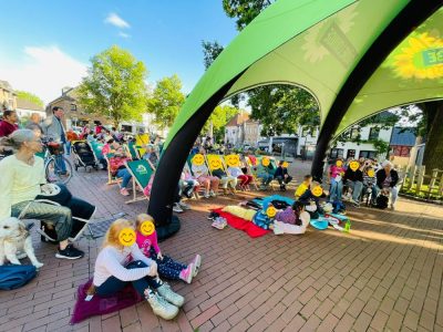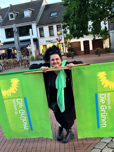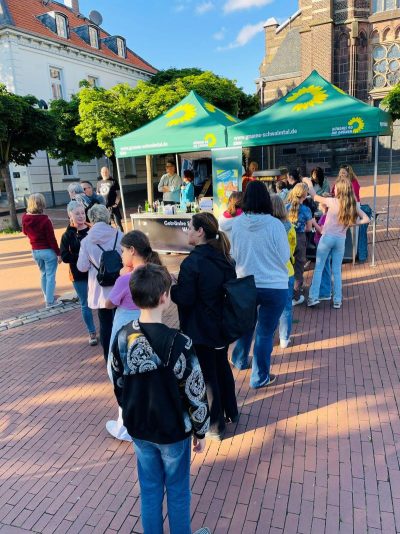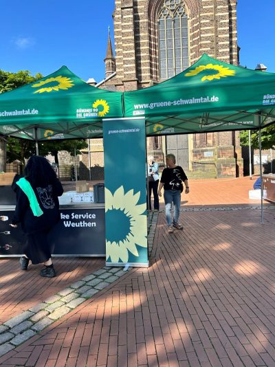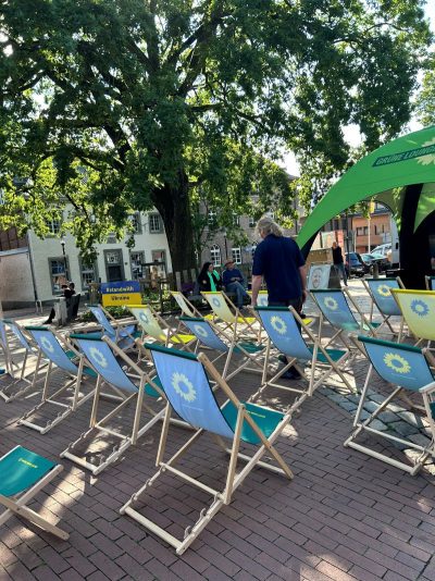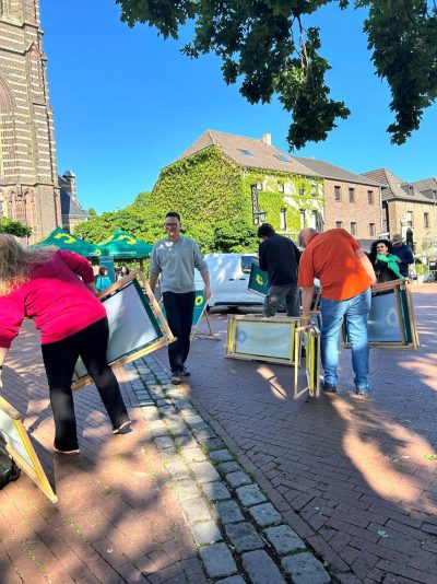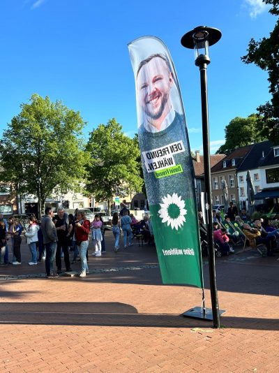 Gegen 18.30 Uhr war alles aufgebaut. Andreas und Benny vom Daniel-Freund-Wahlkampfteam fragten sich, ob wir denn wohl so viele Plätze brauchen würden. Selbst in Düsseldorf und Aachen hätte man nicht so viele gebraucht. Wir hingegen hatten sogar noch zusätzliche Bierbänke besorgt. Wir sahen das gelassen und waren sicher, das wird voll. Möglicherweise hatten die anderen Ortsverbände nicht so tolle fahnenschwenkende Cheerleaderinnen wie wir? 😉