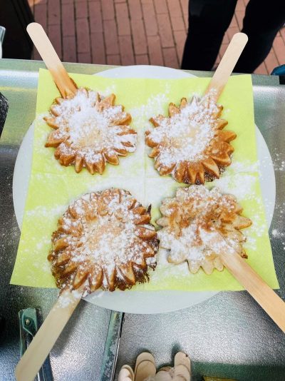 Vor unserem Waffel- und Popcorn-Stand bildete sich eine lange Schlange. Vor allem die Sonnenblumen-Waffeln am Stiel waren sehr begehrt. Unsere Leute hatten alle Hände voll zu tun.