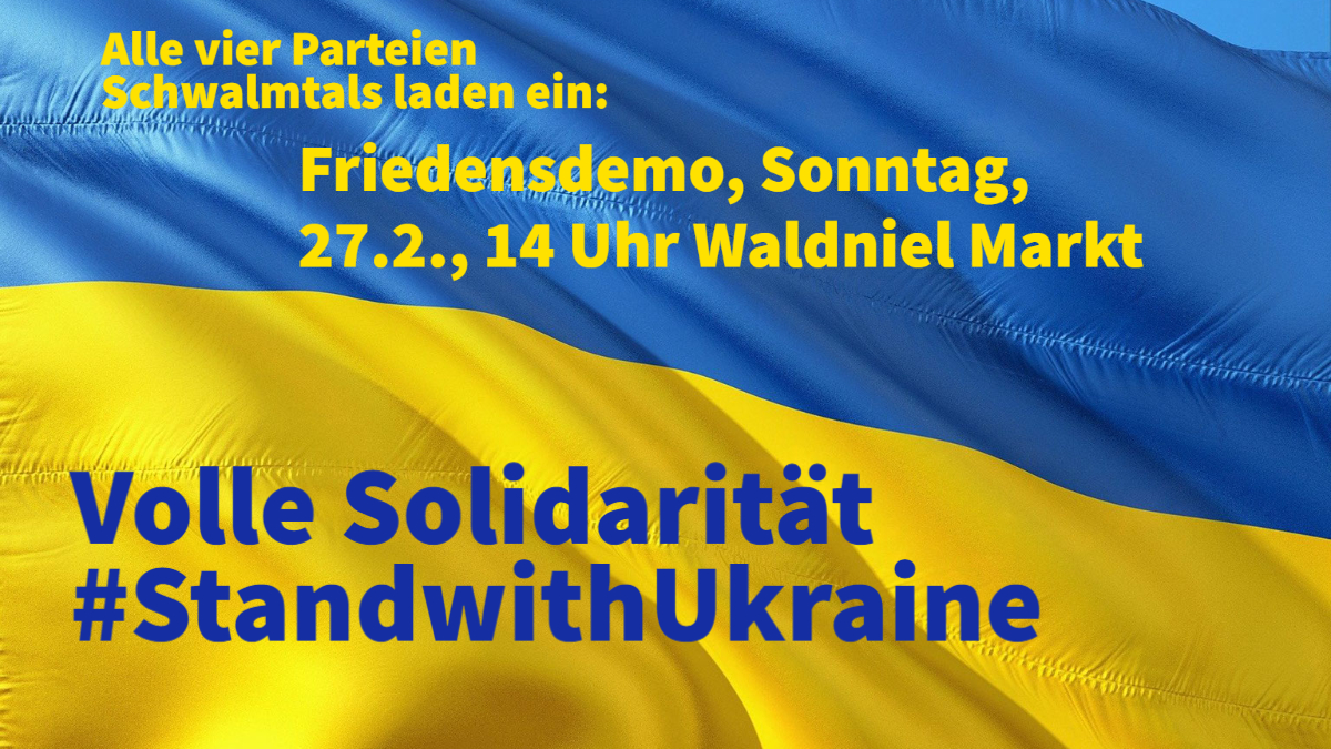 Alle im Rat der Gemeinde Schwalmtal vertretenen Parteien laden Sie gemeinsam ein, für Frieden in der Ukraine und ganz Europa zu demonstrieren. Wir sind entsetzt über die Aggression des russischen Machthabers und möchten ein Zeichen der Verbundenheit und Solidarität mit der Ukraine setzen.