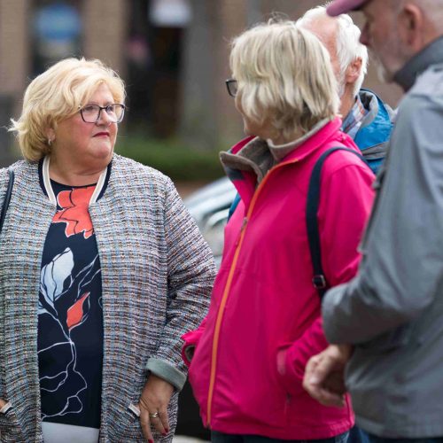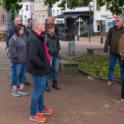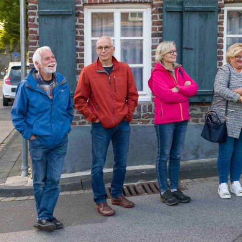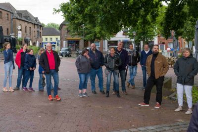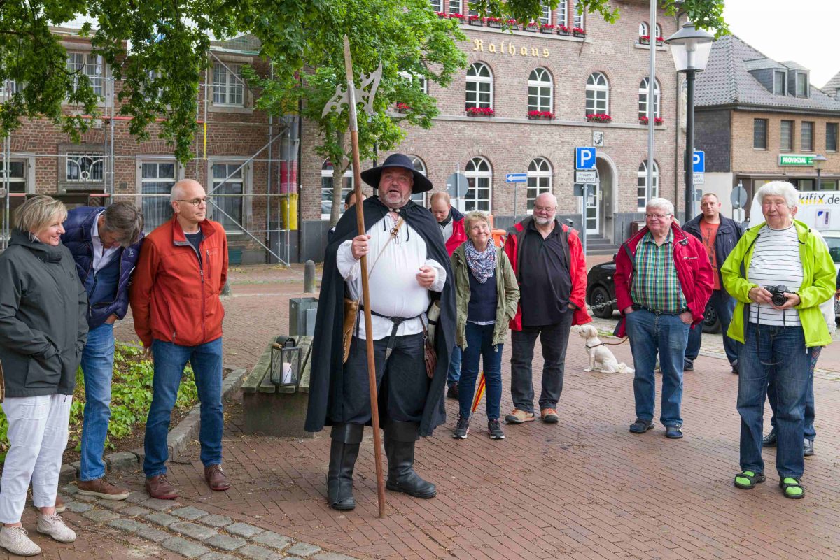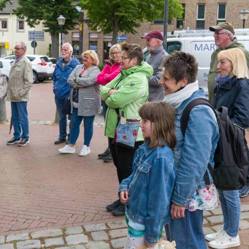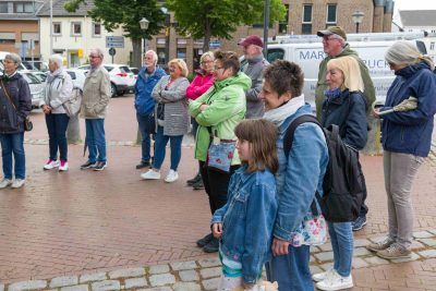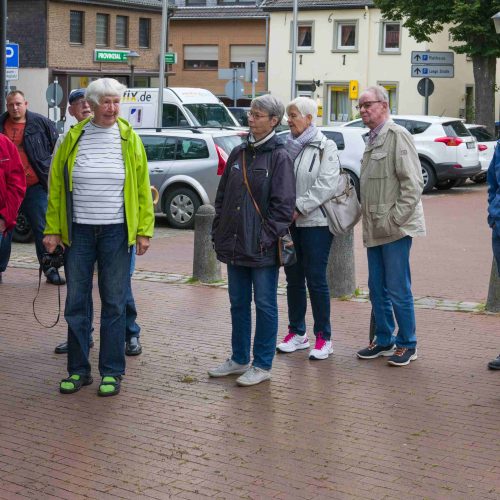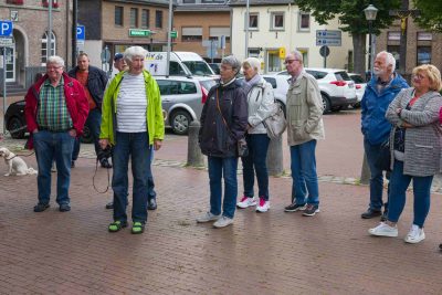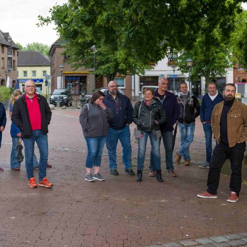 Seine Tour durch unseren Ortskern spickte er immer wieder mit netten Anekdoten – es war wirklich kurzweilig, ihm zuzuhören. Wer gut zuhörte, hat sicher einiges gelernt, was man vorher noch nicht wusste: Dass das ursprüngliche Rathaus dort stand, wo heute auf dem Marktplatz die Wäscherin ist. Dass das alte Wappen und die Madonnenstatue, die auch heute am Gebäude des Rathauses hängen, alles sind, was vom alten Rathaus übrig geblieben ist. Dass die Statue am Rathaus eine wetterfeste Replik ist und das Original im Seniorenheim steht. Dass der Löwe auf dem Waldnieler Wappen der Jülicher Löwe ist, weil Waldniel ca. 500 Jahre lang vom Jülicher Fürsten regiert wurde. Dass das Gebäude, in dem heute die Kleiderkammer der Caritas ist, früher Waldniels Schule war, weshalb die Straße auch heute noch Schulstraße und die Gasse davor Schulwall heißen. Und das sind nur einige Beispiele aus der rund zweistündigen, prall mit Infos gefüllten, kurzweiligen Führung.