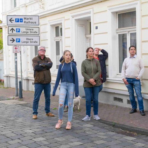 Hier stehen wir in der Lange Straße und er gibt gerade die Antwort auf die Frage, die durchaus auch bei Günter Jauch einiges wert sein könnte: “Wo steht das schmalste Haus Deutschlands”?