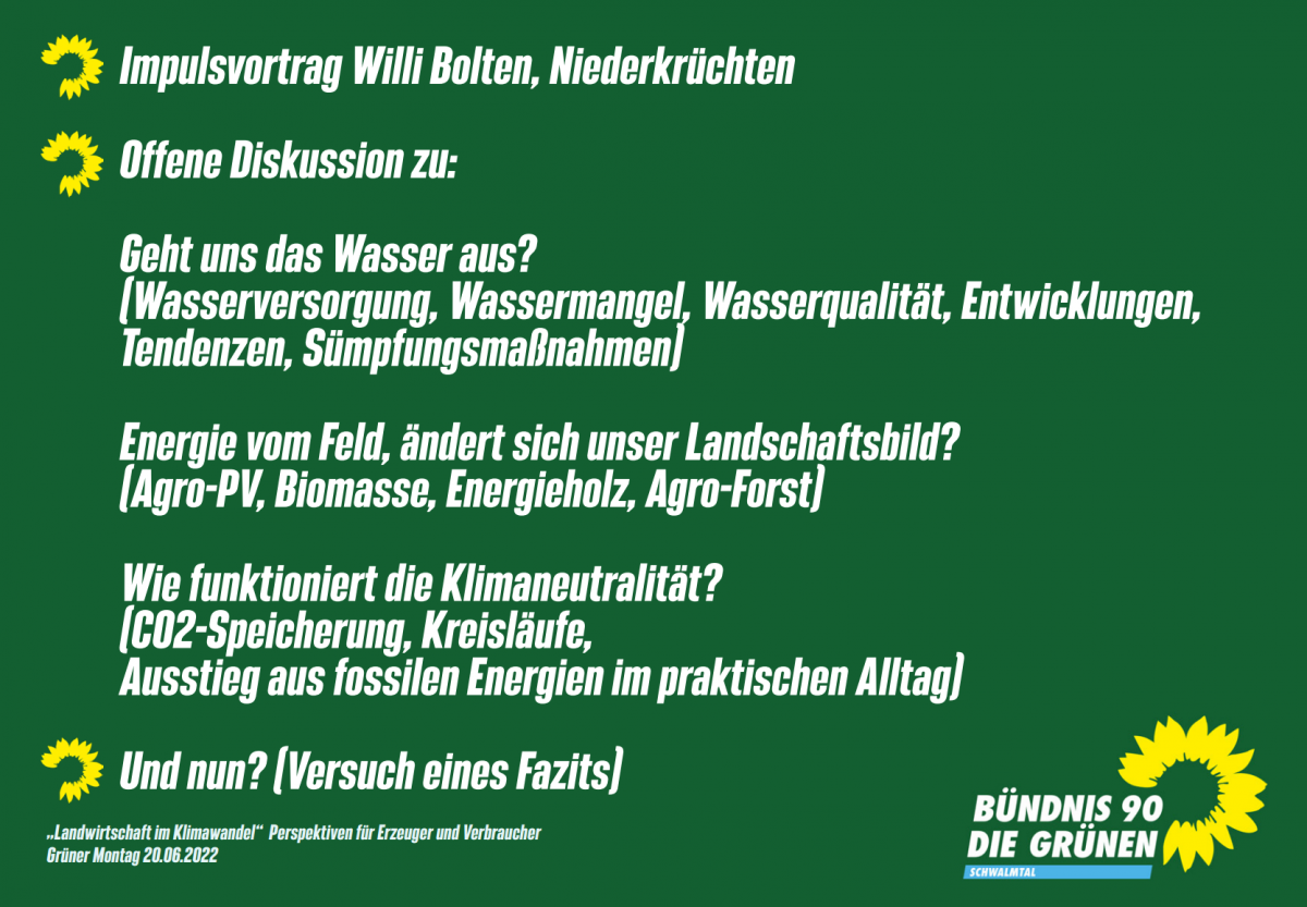 Ganz abgesehen vom Thema dieses grünen Montags wurde den Verbraucher*innen im Publikum an diesem Abend vor allem klar, wie herausfordernd und komplex der Beruf des Landwirts ist – generell und insbesondere in der Klimakrise. Danke an alle, fürs Kommen, Dabeisein, Diskutieren und Zuhören. Ein besonderes Dankeschön an Willi Bolten vom Biohof Bolten.