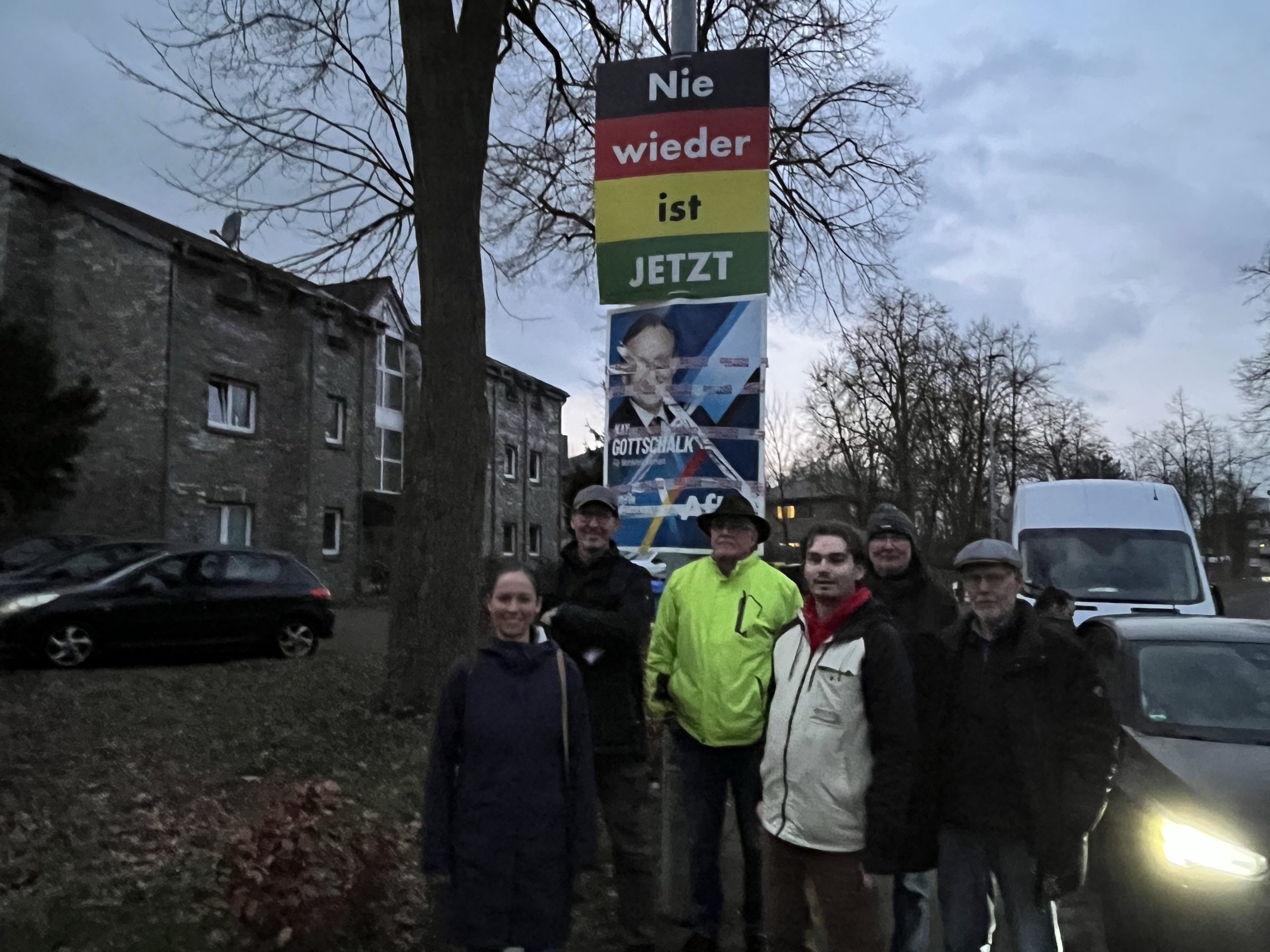 Es wurde eine Plakat-Serie entworfen und am Freitag, dem 31. 01. 2025 im Gemeindegebiet aufgehängt. Die Plakate sind in den vier Parteifarben von CDU, Grünen, SPD und FDP gestaltet, ebenso gibt es ein Motiv mit allen vier Farben und der für alle Teilnehmenden gültigen Feststellung „nie wieder ist jetzt“.