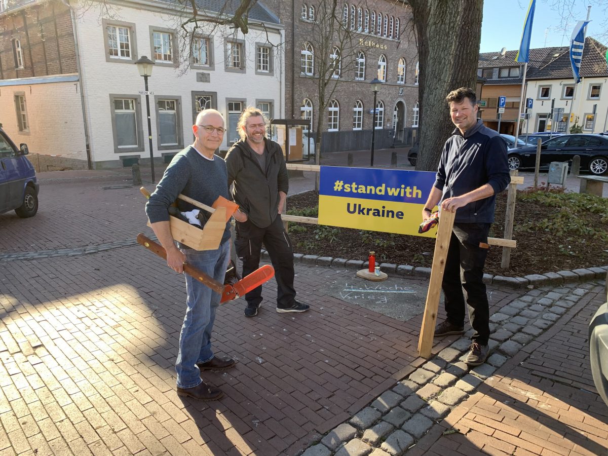 Schon 4 Wochen wütet Putins Krieg in der Ukraine – schon viel zu lange und leider ist immer noch kein Ende abzusehen. Wir alle können nicht viel tun. Aber wir können unsere Anteilnahme aufrecht erhalten und vor allem auch den nun auch zu uns kommenden Menschen aus der Ukraine zeigen: Wir hier in Schwalmtal stehen an eurer Seite. Und auch Schwalmtaler:innen mag es gut tun, im Alltag an diesem kleinen Mahnmal kurz innezuhalten, ein paar Gedanken dort zu lassen – kann man auch rein physisch tun, dafür steht extra ein Glas mit Kreide dort. Das kann man natürlich jederzeit tun – aber auf jeden Fall auch jeden Donnerstag – der Wochentag, an dem der Krieg begann – um 19 Uhr ist hier der Ort für alle, die in einer kurzen Mahnwache zeigen wollen: #WeStandWithUkraine.