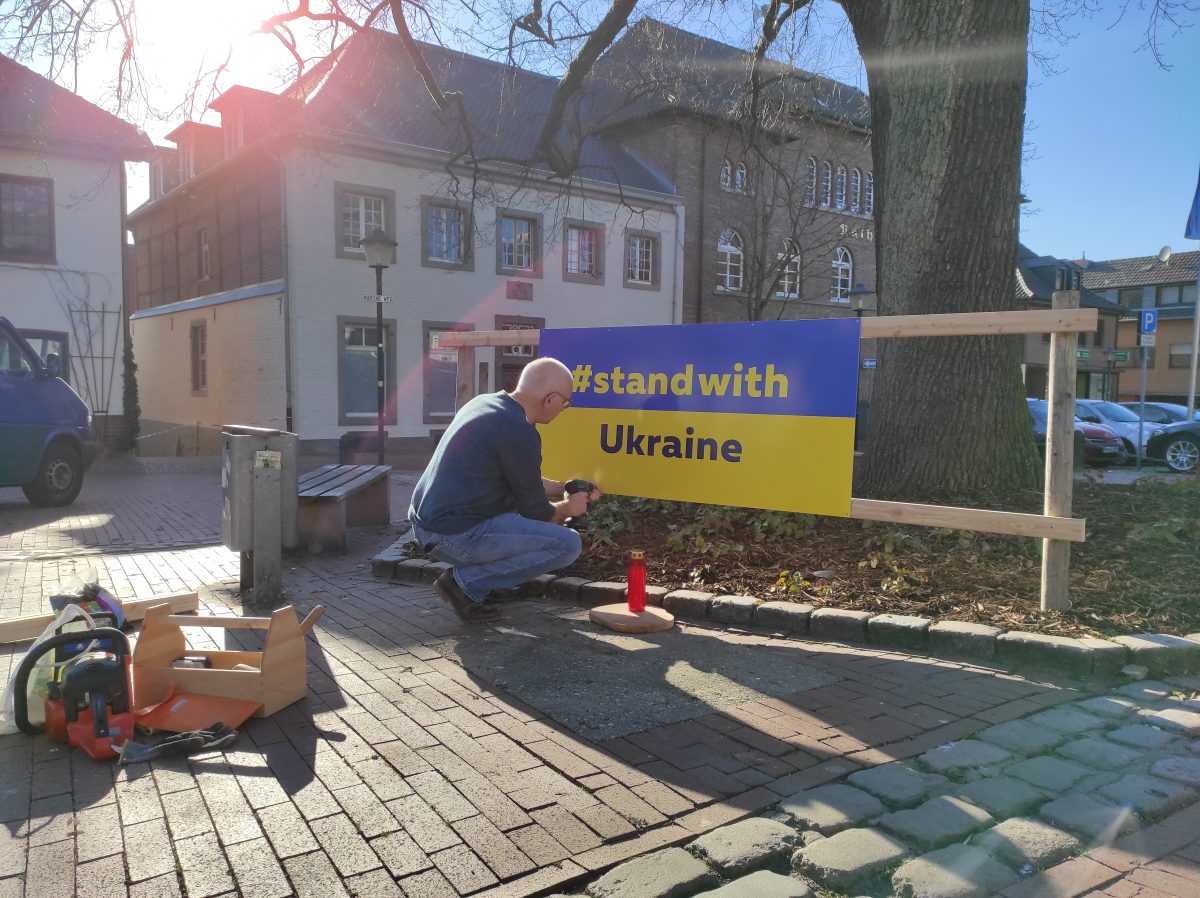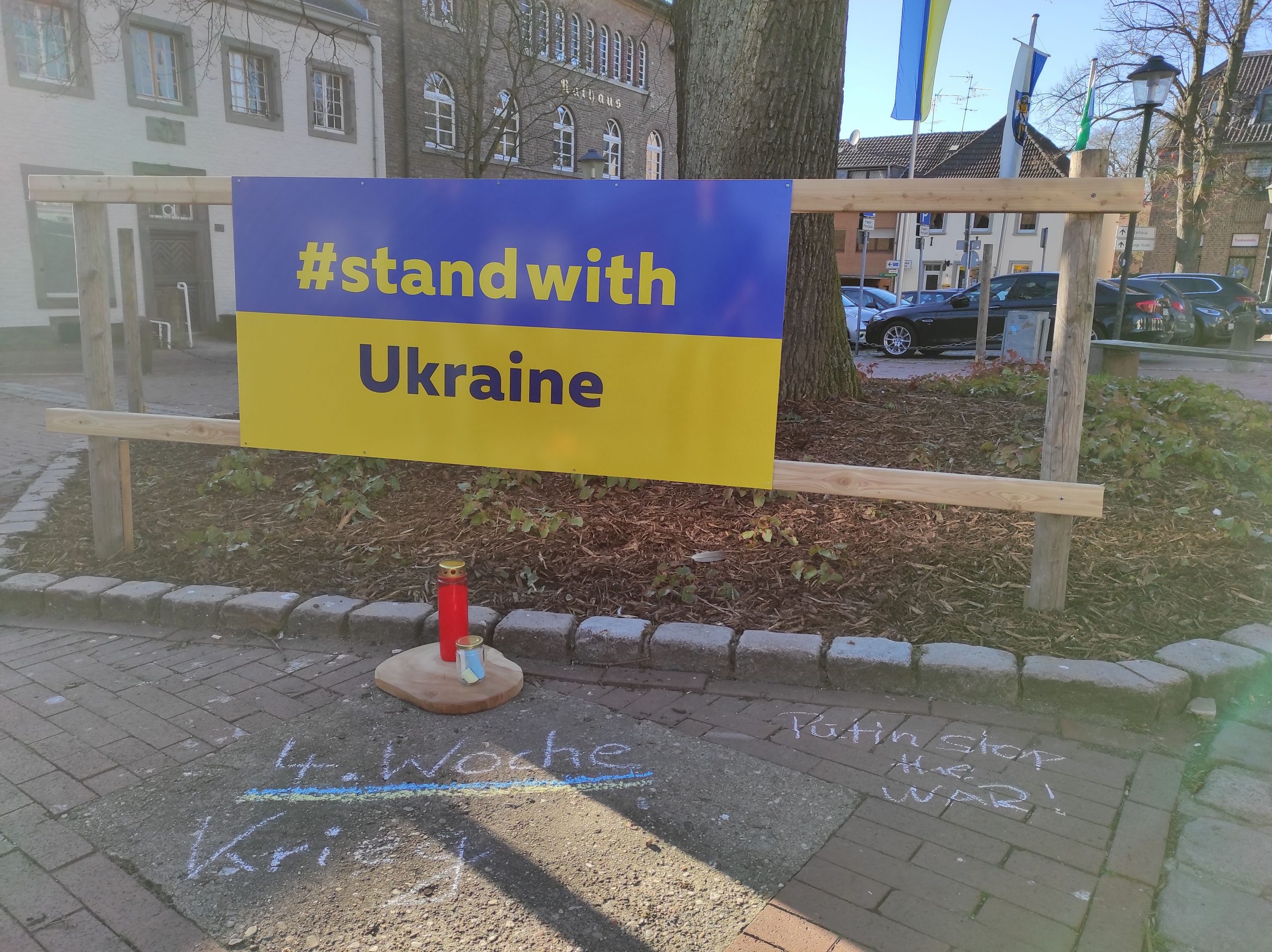 Schon 4 Wochen wütet Putins Krieg in der Ukraine – schon viel zu lange und leider ist immer noch kein Ende abzusehen. Wir alle können nicht viel tun. Aber wir können unsere Anteilnahme aufrecht erhalten und vor allem auch den nun auch zu uns kommenden Menschen aus der Ukraine zeigen: Wir hier in Schwalmtal stehen an eurer Seite. Und auch Schwalmtaler:innen mag es gut tun, im Alltag an diesem kleinen Mahnmal kurz innezuhalten, ein paar Gedanken dort zu lassen – kann man auch rein physisch tun, dafür steht extra ein Glas mit Kreide dort. Das kann man natürlich jederzeit tun – aber auf jeden Fall auch jeden Donnerstag – der Wochentag, an dem der Krieg begann – um 19 Uhr ist hier der Ort für alle, die in einer kurzen Mahnwache zeigen wollen: #WeStandWithUkraine.